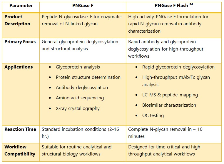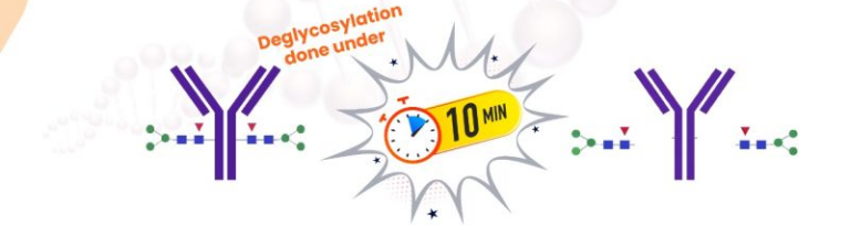 - Rapid deglycosylation of N-linked glycans in minutes, significantly reducing incubation time.