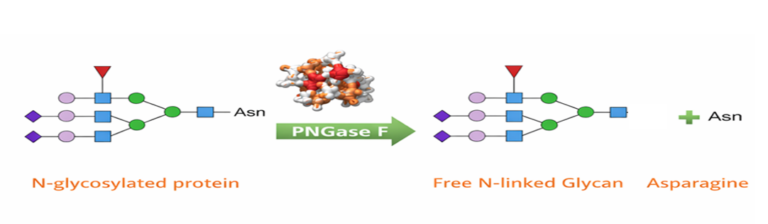 - Catalyzes cleavage of the asparagine-linked N-acetylglucosamine, enabling release of intact N-linked glycans.